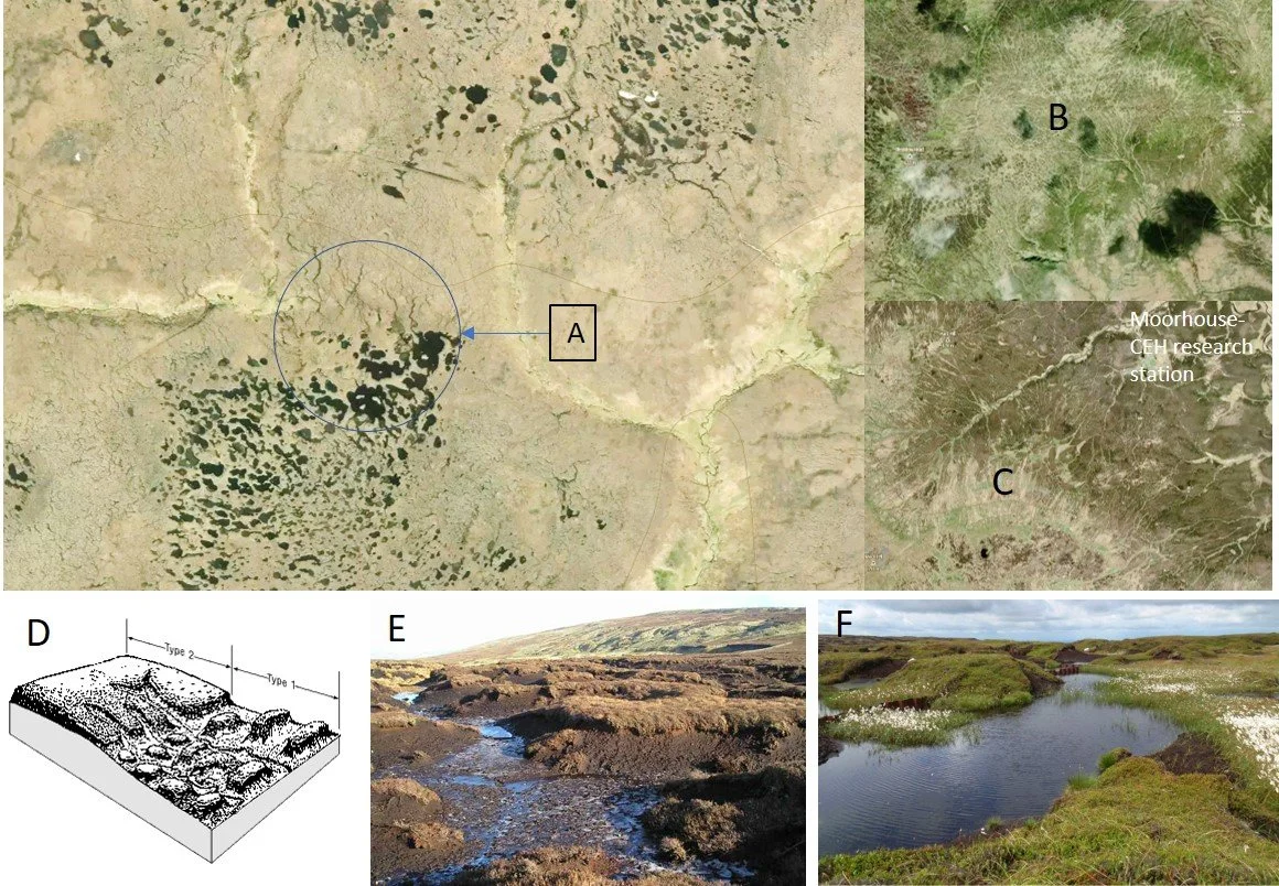 Through my time working on the restoration of eroded peat in the South Pennines, I became familiar with the two main categories of erosion first described and named after Bower (1960, Figure 4D) as Bower Type 1 dissection erosion on gradients of less than 5 degrees (highlighted in figure 4C from Bleaklow, South Pennines and photo, figure 4E), which results in a landscape of isolated ‘peat hags’ amongst a sea of mineral and thin peat, and Bower Type 2 linear gully erosion on slopes of 5 degrees or greater, which we find on sloping gradients that drain towards drainage channels (Figure 4C shows these gullies at Moorhouse NNR in the North Pennines, which have all naturally revegetated). We know that many of the type 2 gullies start off as either, headward erosion from the peat margins, peat runnels created by the removal of keystone vegetation species or seepage on weak lines, this latter one is often connected to changes in sub peat (catotelm) hydrology and the formation of peat pipes, when combined with removal and degradation of the peat surface above them, this can lead to rapid creation of a gully, that is deepened and widened with further headward erosion.. In addition, we know that fire can be a major component in the creation of the extensive type 1 dissection erosion seen on the flatter areas.