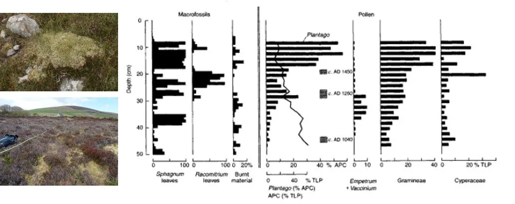 Although we don’t have photographic evidence or extensive spatial botanical data to what Kinder Scout and Bleaklow plateau was pre-erosion, we do thanks to the work of palaeoecologist John Tallis have an understanding of the broad vegetation changes that have occurred throughout the last 3000 years. Tallis wrote several papers in the Journal of Ecology throughout the 1980s and 1990s, attempting to understand the historical context to the erosion, in his Tallis (1994) paper he described the pool and hummock patterning (a climatically controlled microtopographic vegetation gradient in ombrotrophic peatlands, discussed in detail in the next post) which is central to the peat formation process. From his peat cores, he concluded that this slow dynamic process; where over many cycles of climatic changes sees pools expanding in wetter periods, or hummocks upgrowing in drier periods, had slowed in the South Pennines during and then following the Early Medieval Warm Period (an abrupt period of much warmer climate c. AD950-1250). The result was a gradual process of the hollows drying out and creating an avenue for erosion and the onset of Type 1 dissection erosion. Initially, Tallis (1994) suggested this as early as AD900-1000 but later revised this to c. AD1450 (Tallis, 1995) after analysis of the Racomitrium lanuginosum layers, which autoecology puts it as an oceanic species indicated a shift to a wetter, humid climate, which could be seen after these dates in the stratigraphy (Figure 5).