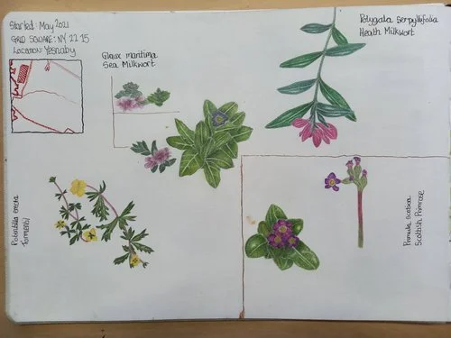 For this project, I have illustrated Primula Scotica larger than its true size, to emphasis the features. I started by producing a full colour sketch in my sketchbook, to work out the the right watercolour pencil and dry colour pencil combination, as this is a piece of work I am doing using the 'Wendy Hollander' method.